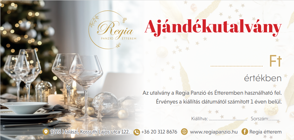 Lepd meg szeretteidet, barátaidat vagy kollégáidat egy igazán különleges élménnyel! A Regia Panzió és Étterem ajándékutalványa ideális választás, ha felejthetetlen gasztronómiai élményt szeretnél ajándékozni. Az utalvány rugalmasan felhasználható, és 1 évig érvényes a kiállítás dátumától kezdve, így a megajándékozott kényelmesen kiválaszthatja a számára legmegfelelőbb időpontot.