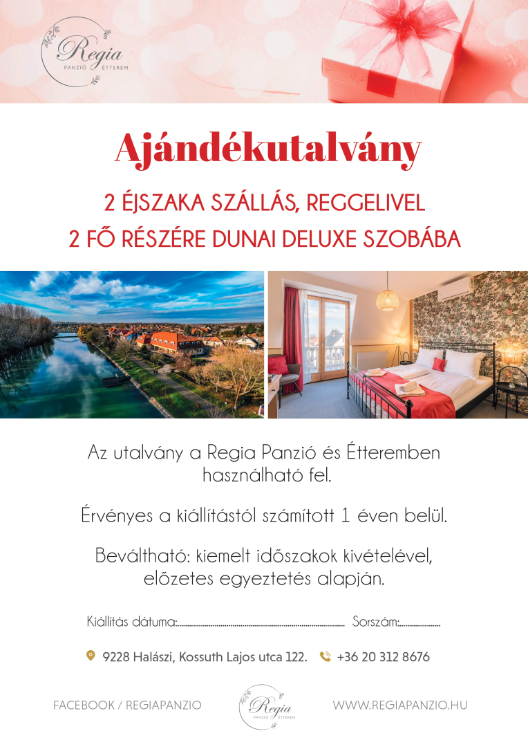 Ajándékozz felejthetetlen kikapcsolódást szeretteidnek! Az ajándékutalvány 2 éjszakás szállást tartalmaz reggelivel, 2 fő részére, a Regia Panzió elegáns Dunai Deluxe szobájában. A panzió és étterem idilli környezetben, Halászi szívében várja vendégeit, tökéletes helyszínt biztosítva a feltöltődéshez és kikapcsolódáshoz.